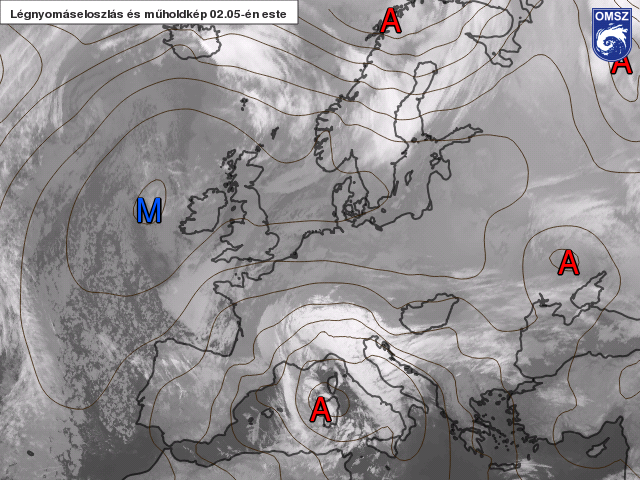 1. kép: Infravörös műholdkép és nyomáseloszlás. A mediterrán ciklon felhőzete, és "A" betűvel jelölt,