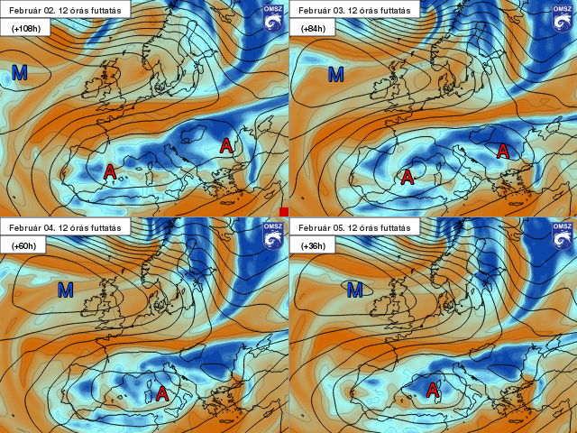 A mediterrán ciklon, amelytől a nagy csapadékot és a havazást vártuk, ki is alakult Olaszország felett, ez szépen látszik az 1. képen. Nézzük meg ezután a 2. képet! Ezen az elmúlt, egymást követő négy napon (02.02-02.05.) futtatott számítógépes előrejelzéseket láthatjuk az európai nagytérségű időjárási helyzetre vonatkozóan. Mindegyik napi futás ugyanazt az időpontot - 02.06. péntek estét - mutatja, a bal felső sarokból indul a hétfőn készült előrejelzéssel, és a jobb alsóban ér véget a csütörtök déli modellfuttatással. Első ránézésre a modellfutások ugyanazt ábrázolják: hatalmas anticiklont a Brit-szigetek térségében (M betűvel jelölt objektum), és nagy kiterjedésű ciklont Dél-Európa felett (A betűvel jelölve). Az anticiklont többnyire száraz levegő tölti ki, míg a mediterrán ciklon igen nagy mennyiségű nedves levegőt szállít.