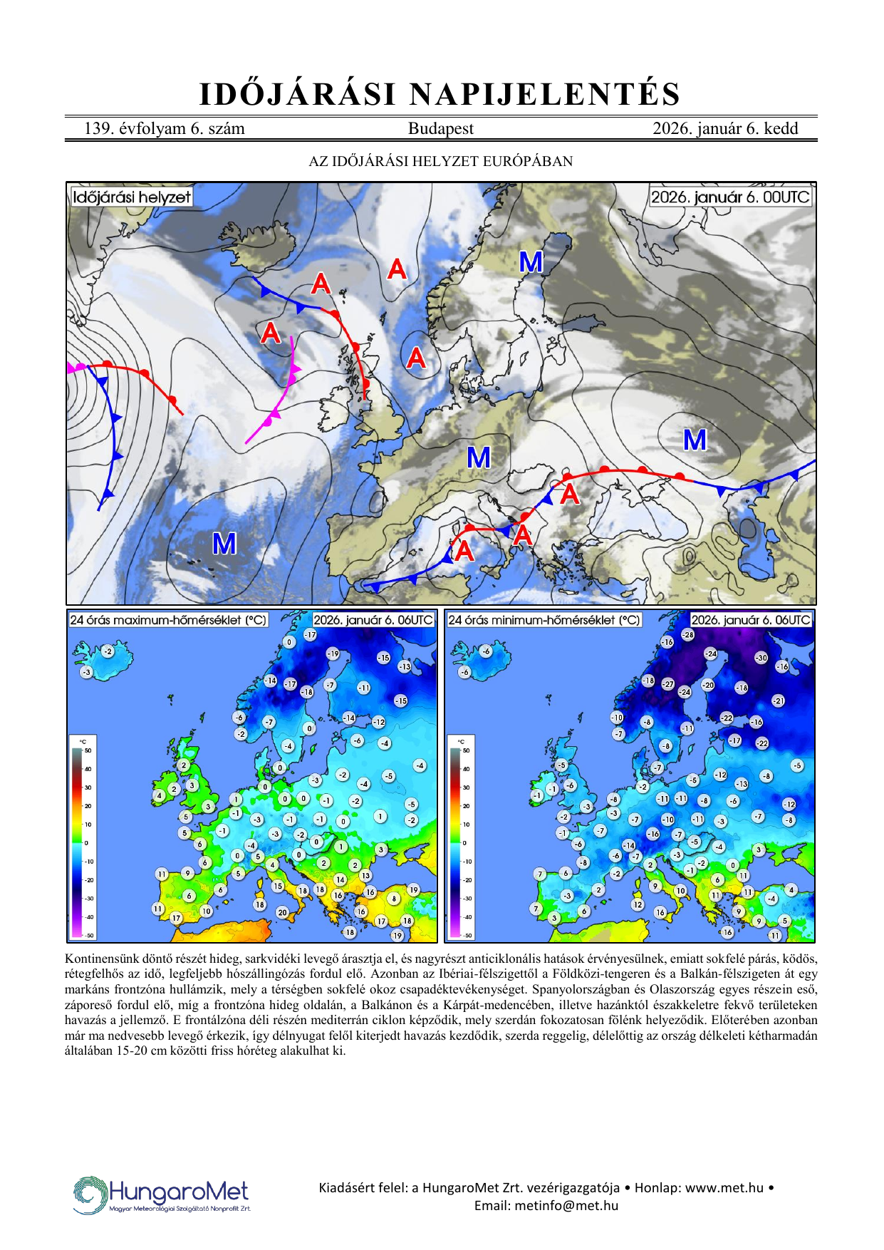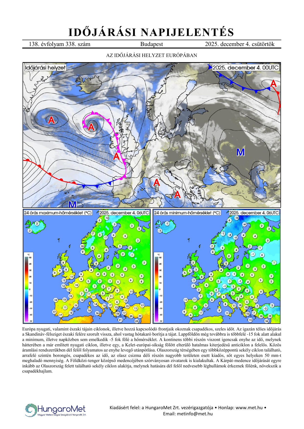 Az európai kitekintés a fronttérkép és a rövid szöveges elemzés mellett bővül a hőmérséklet napi minimum- és maximumértékeit ábrázoló térképekkel.