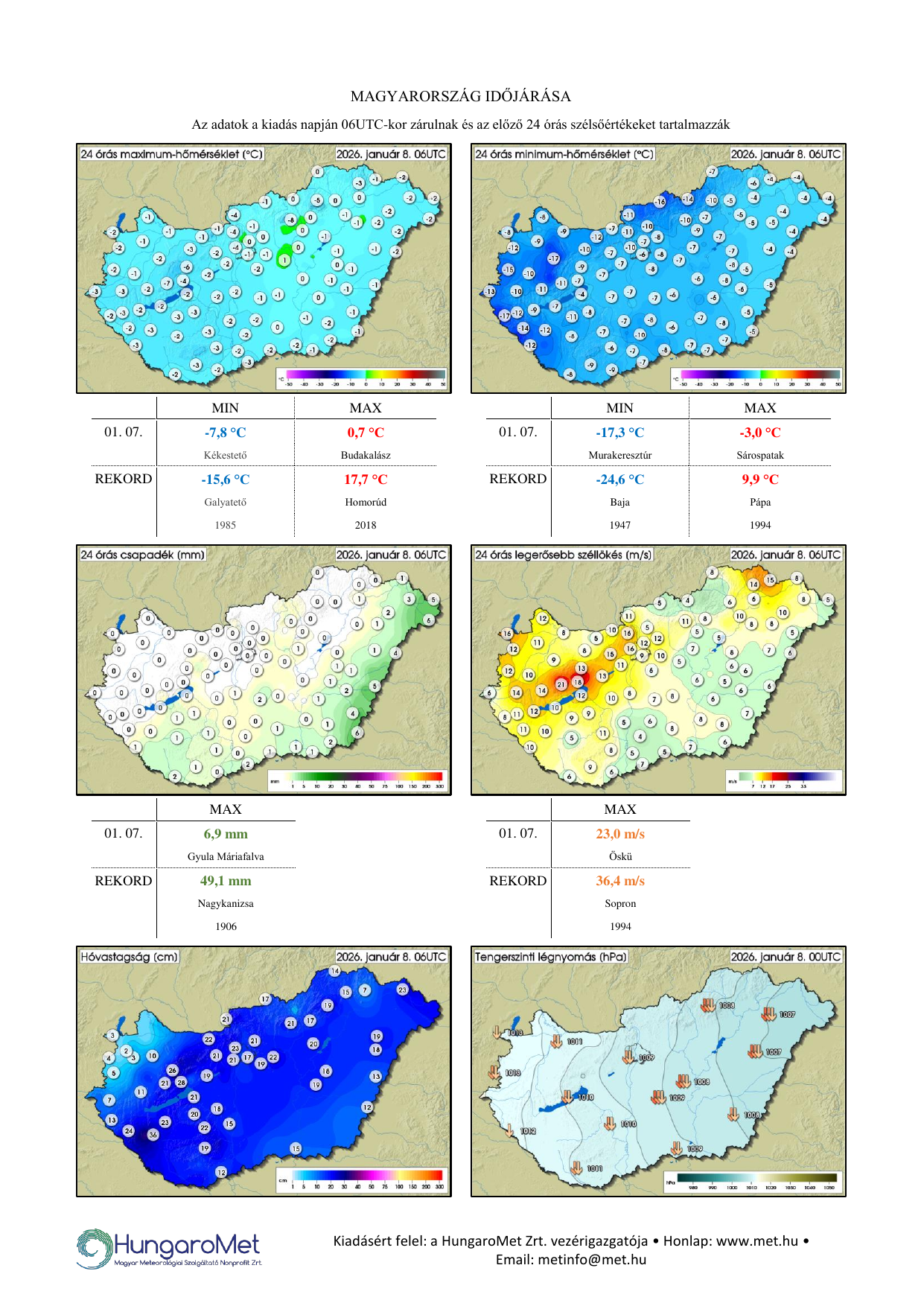 A meteorológiai elemek OMSZ által mért napi értékei ezentúl kontúrtérképeken jelennek meg, de továbbra is tartalmaznak konkrét számértékeket, a korábbinál jóval több állomásról. A térképek alatt táblázatos formában feltüntetjük a napi szélsőértékeket és az abszolút napi rekordadatokat. Az eddigiektől eltérően a napi (24 órás) adatok egységesen, 06 és 06 UTC közötti időszakot fednek le – nagyobb összhangban a nemzetközi gyakorlattal.