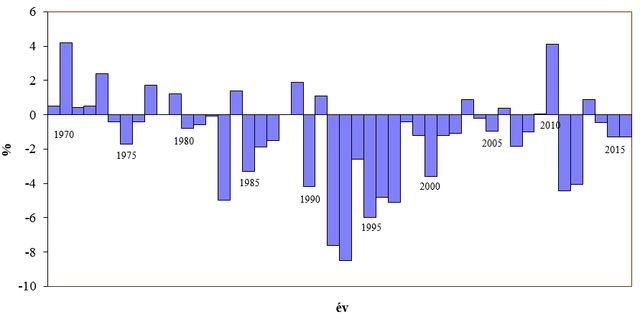 A légoszlop teljes ózontartalmának éves átlagai az 1969 és 2016 közötti időszakra