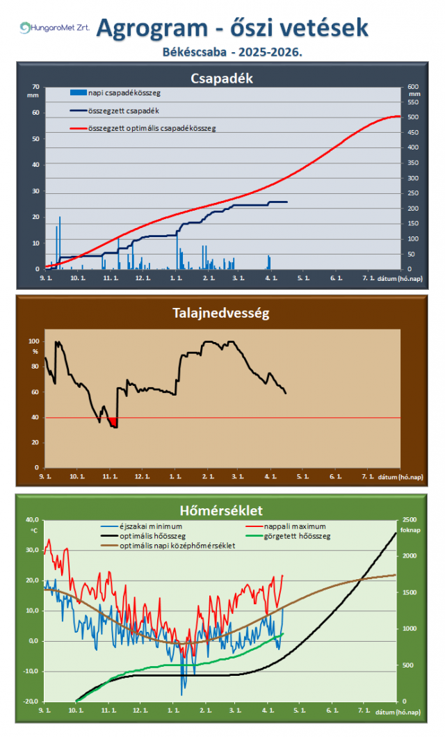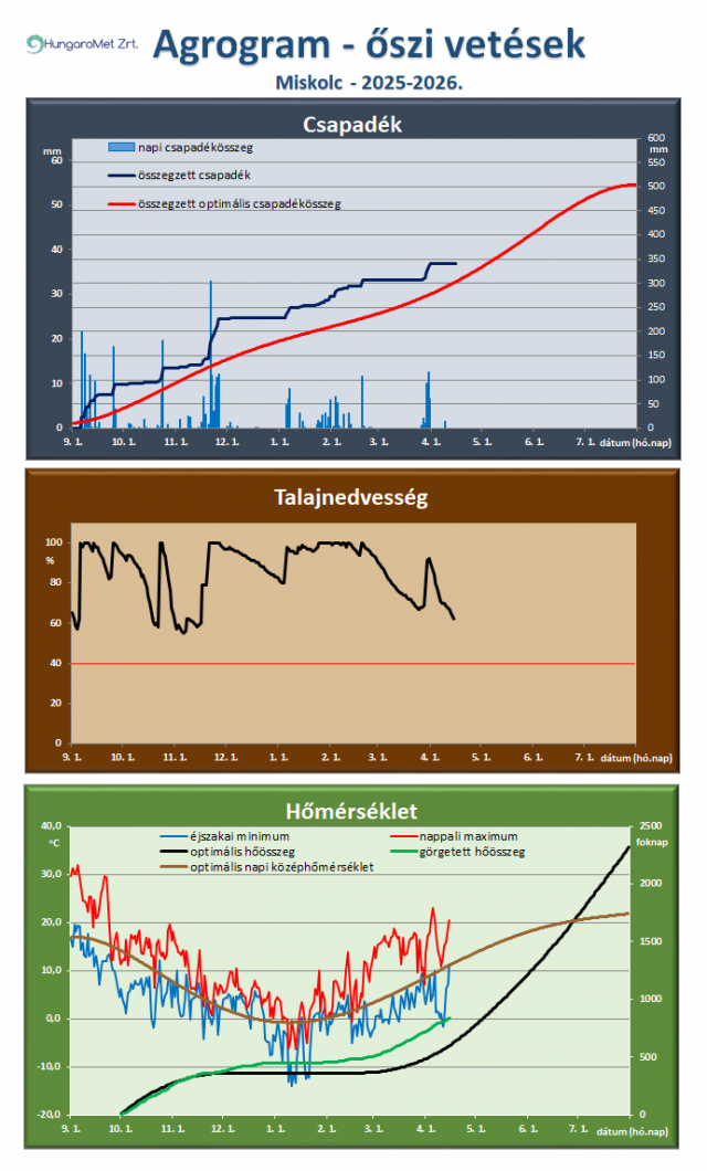 * Az őszi vetésű kalászosok és az őszi káposztarepce számára ideális, illetve a tényleges időjárási paraméterek (csapadék, talajnedvesség, hőmérséklet) összevetése látható az agrogramnak elnevezett ábrán. A legfelső, a csapadékot ábrázoló grafikonon megjelenik a napi csapadék (bal oldali tengelyen), az időszak során összegzett és a növény számára optimális összegzett csapadék (jobb oldali tengelyen). Így jól látszik a két utóbbi érték közötti eltérés, ami a csapadékhiányt vagy -többletet mutatja. A talajnedvesség ábrán a növények számára felvehető hasznos vízkészlet százalékában vannak megadva az értékek. November 20-ig a talaj felső 20 cm-es rétegét, a későbbiekben a felső 50 cm-es rétegének nedvességtartalmát ábrázoljuk. A már kritikusnak tekinthető 40%-os érték alatti időszakot pirossal emeljük ki. A hőmérséklet ábrán a napi hőmérsékleti szélsőértékek mellett a növény számára optimális napi középhőmérsékletet (bal oldali tengelyen), valamint a görgetett hőösszeget (2 Celsius fokos bázissal) és ennek optimális értékeit mutatjuk be (jobb oldali tengelyen).