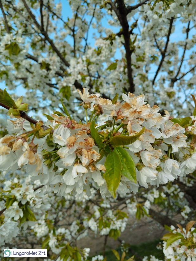 Részleges fagykárt szenvedett cseresznye (a virágoknak az ég felé eső része sérült, míg a talaj felé néző része ép) Miskolc térségében 2026. április 12-én (fotó: Kovács Attila)