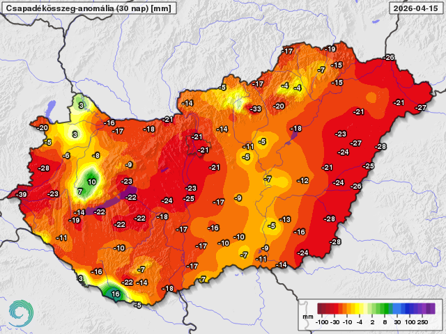 Az elmúlt 30 nap csapadékösszegének eltérése a sokéves átlagtól 2026. április 15-ig (mm)