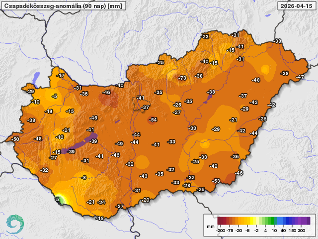 Az elmúlt 90 nap csapadékösszegének eltérése a sokéves átlagtól 2026. április 15-ig (mm)