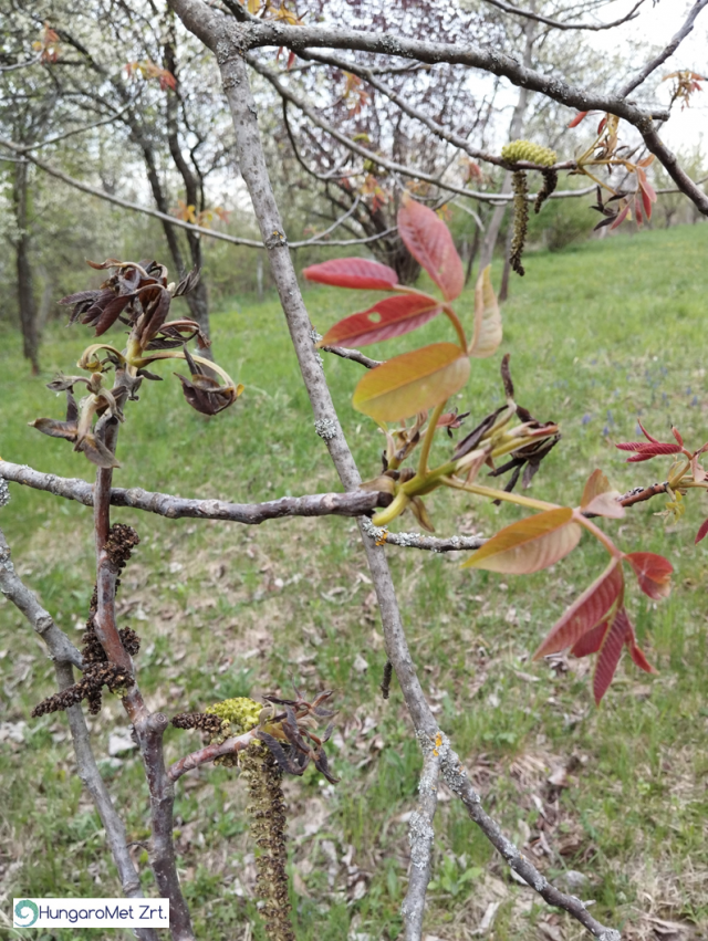Részleges fagykárt szenvedett dió: a hajtások egy része megfagyott (bal oldal), míg más része épen maradt (jobb oldal) Miskolc térségében 2026. április 15-én (fotó: Kovács Attila)