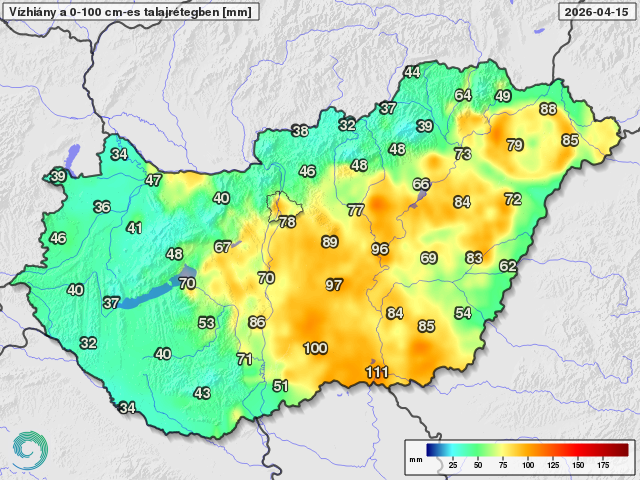 Vízhiány a talaj fölső egy méteres rétegében a telítettséghez képest 2026. április 15-én (mm)