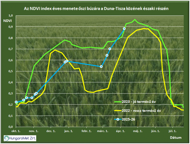Az NDVI műholdas vegetációs index éves menete a tenyészidőszak során őszi búza táblákon (8 véletlenszerűen kiválasztott tábla átlaga) a Duna-Tisza közének északi részén a Sentinel-2 műholdak mérései alapján egy jó és egy rossz termést adó évhez viszonyítva (a búza termésátlagánál a meghatározó hónapok az április, a május és a június)
