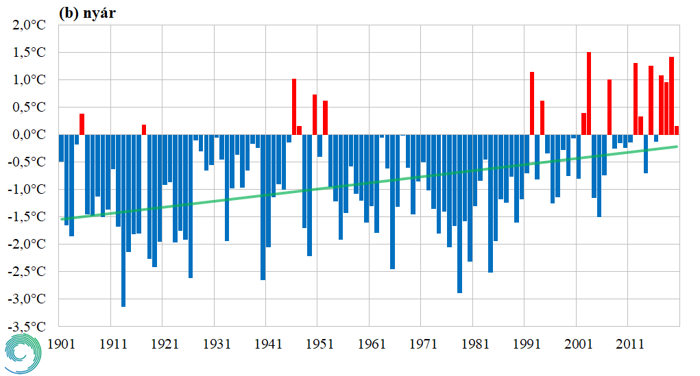 Magyarország éves és évszakos középhőmérsékleteinek idősora a globális tendenciákkal összhangban alakul, azonban a kisebb terület miatt nagyobb változékonyságot mutat. A változások szemléltetése érdekében az éves és évszakos értékek anomáliáit, vagyis a jelen éghajlati állapotot leíró, 1991–2020 időszak átlagértékétől való eltéréseit, ábrázoljuk grafikonon a XX. század elejétől 2020-ig (1-2. ábra).