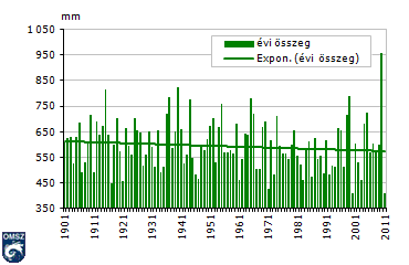Az országos évi csapadékösszegek 1901 és 2011 között (58 állomás homogenizált, interpolált adatai alapján)