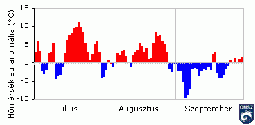 szintén melegebb volt az átlagnál, országosan mintegy 1,9°C-kal. Az átlag feletti havi középhõmérséklet a hónap kétharmadában tapasztalható, átlagnál akár 8-10 fokkal melegebb idõszakoknak volt köszönhetõ. Országon belül ugyanakkor markáns eltérések mutatkoztak az augusztusi hõmérsékleti anomáliákban. Az ország keleti-délkeleti régiója volt a legforróbb, itt az augusztus 3-3,3 fokkal volt melegebb a szokásosnál, a legenyhébb délnyugati országrészben ezzel szemben a pozitív anomália helyenként az 1°C-ot sem érte el.