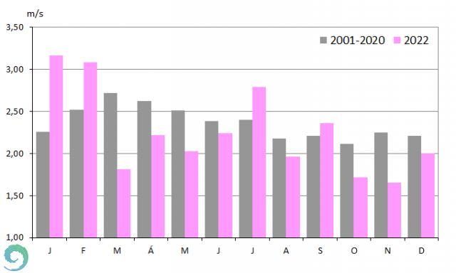 A szélsebesség évi átlaga hazánk területén többnyire 1,5 és 3,5 m/s között változott, az országos átlag 2001-2020 között 2,6 m/s volt, míg 2024-ban 2,4 m/s-nak adódott. A legmagasabb évi átlagok a Dunántúl északi részén és a Tiszántúlon voltak jellemzőek, ahol nagyobb összefüggő területen a szélsebesség elérte a 3 m/s-ot. A Dunántúli-középhegység magasabban fekvő csúcsai esetén előfordultak 4 m/s-ot meghaladó értékek is. A szélsebesség átlagos éves menetét jól mutatják a szürke oszlopok a 14. ábrán. Január elejétől márciusig növekszik az országos átlag, majd augusztusig csökken, és újra növekedni kezd egészen az év végéig. 2024-ben az országos szélsebességek havi átlagai januárban, februárban és szeptemberben haladták meg a sokévi átlagot. Márciustól egészen augusztusig és októbertől az év végéig a havi szélsebesség értékek elmaradtak az átlagtól, a legnagyobb eltérés május, június majd november, december hónapokban volt jellemző. A legalacsonyabb átlagos szélsebesség novemberben volt (~1,77 m/s), amit a december (~1,84 m/s) és a június (~1,89 m/s) követett. A legjelentősebb pozitív eltérés januárban adódott, míg a legszelesebb hónap a február volt (>2,7 m/s).
