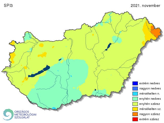Aszály szempontjából a tavaszi időszakot összességében legjobban az SPI3 májusi eloszlása jellemzi (12. ábra). A 2022-es tavaszi csapadékösszeg jelentősen elmaradt a szokásostól, főként a Tiszántúlon és Bács-Kiskun megye déli részén jelentkezett nagyobb csapadékhiány, ezeken a területeken nagyon száraz, valamint extrém száraz feltételek is kialakultak a tavasz folyamán, de Szabolcs-Szatmár-Bereg megye, Hajdú-Bihar megye bizonyos régiói, Jász-Nagykun-Szolnok és Csongrád-Csanád megyék területén is nagyon, vagy extrém száraz állapotok domináltak. Az ország többi részén az enyhén száraz kategória volt a meghatározó. Csupán a Mezőföldön és a Duna-menti síkságon alakult ki nagyobb, összefüggő terület, amely az enyhén nedves kategóriába sorolható.