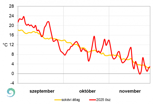A 2025-ös ősz napi középhőmérsékleteit és a sokéves átlag értékeit a 9. ábrán mutatjuk be. Az évszak 91 napjából 52 napon a normálnál magasabbak voltak a napi átlaghőmérsékletek. Szinte az egész szeptember melegebbnek adódott a megszokottnál, 5-e lett az évszak legmelegebb napja, amikor 23,7 °C volt a napi középhőmérséklet. Ezen a napon mértük ősszel a legmagasabb hőmérsékletet (35,1 °C) is Körösladányban és Körösszakálon, ami egyben új országos napi melegrekord. A normáltól való legnagyobb pozitív eltérés 22-én adódott, több, mint 7 fokkal volt melegebb az átlagnál. 25-én kezdődött egy erőteljes lehűlés, mely hideg periódus október 8-ig tartott. Október 3-án éltük át a legnagyobb negatív anomáliát: országos átlagban 6,2 °C-kal maradt el a hőmérséklet az 1991-2020-as értéktől. Ezt követően a sokéves átlagnak megfelelően alakult időjárásunk, majd két hidegebb nap (19-20) után melegedés volt megfigyelhető. A hónap végén és november elején már 4-6 fokkal mértünk magasabb hőmérsékletet, mint ilyenkor az szokásos. November közepén a Kárpát-medencét több napig egy hidegpárna töltötte ki, majd melegedés kezdődött, mely 17-én tetőzött. Viszont az ekkor érkező markáns hidegfront mögött már sarkvidéki eredetű hideg levegő áramlott hazánk fölé. Az ősz leghidegebb napján, 23-án fagypont alá süllyedt a napi középhőmérséklet (-0,2 °C).