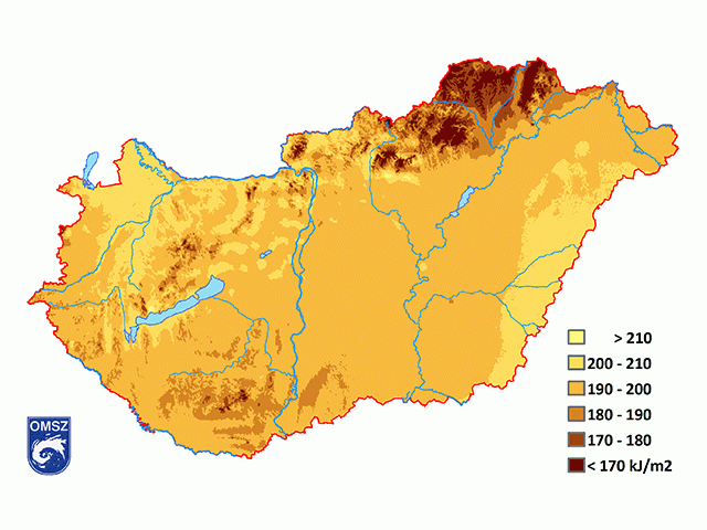 A legalacsonyabb globálsugárzás értékeket az észak - északkeleti országrészben figyelhetjük meg (11. ábra): a Zemplénben 35 kJ/cm2 alatti érték is előfordult. A legtöbb globálsugárzás a Dunántúlon és az Alföld középső-déli részén érkezett (több mint 45 kJ/cm2).