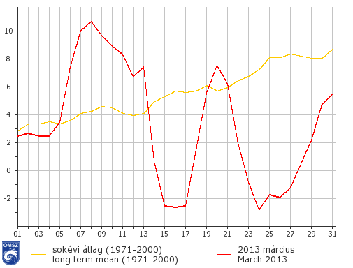 A napi középhőmérsékletek alakulását tekintve láthatjuk, hogy a hónap első felében egy átlagosnál jóval melegebb periódus jelentkezett 5-e és 13-a között; az időszak – s egyben a hónap – legmelegebb napján, 8-án 10,7°C-os országos középhőmérsékletet mértünk, mely áprilisra jellemző érték. Ugyanezen a napon regisztráltuk a hónap legmagasabb állomási hőmérsékletét is: Baja Csávoly állomáson 20,8°C-ot mértünk. Ezután azonban egy igen erőteljes lehűlés következett (országos átlagban közel 7°C-os hőmérséklet-csökkenést tapasztaltunk 13-áról 14-ére), jóval átlag alatti középhőmérsékleteket eredményezve, mely – 1-2 enyhébb naptól eltekintve – kitartott a hónap végéig. A leghidegebb nap országos átlagban 24-e volt, ekkor -2,8°C-os országos középhőmérséklet adódott. A legnagyobb negatív anomáliát azonban nem ezen a napon, hanem 26-án regisztráltuk, ekkor 10°C-kal volt hidegebb a sokéves átlagnál. A hónap legalacsonyabb hőmérsékletét, -18,2°C-ot 17-én mértük Vásárosnamény állomáson, mely alulmúlta az idei tél (2012. december-2013. február) legalacsonyabb mért hőmérsékletét (-18,1°C, Nyírlugos, december 10.).