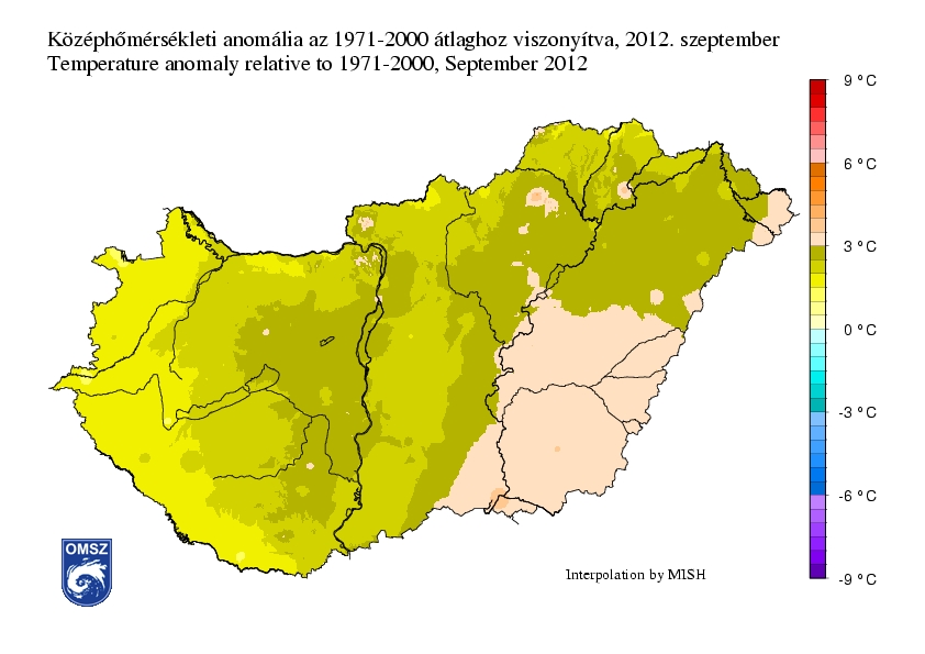 Az 1971-2000-es normálhoz viszonyítva elmondhatjuk, hogy az idei szeptember az ország egész területén átlagnál melegebb volt. A legkisebb pozitív anomália hazánk nyugati részén volt, itt +1,5-2 °C volt a különbség. A középső és az északi országrészben 2-3 °C-kal volt melegebb a hónap a normálnál, míg az előző térképen is a legmelegebb területként jelentkező, délkeleti térségben volt a legnagyobb az eltérés, itt a +3 °C-ot is meghaladta.