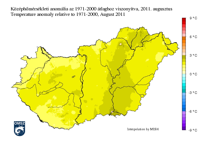 Országszerte melegebb volt az idei augusztus, a sokéves átlaghoz képest a különbség mindenütt meghaladta a +0,5 °C-ot. A szokásoshoz képest legmelegebb terület a Tisza mentén rajzolódott ki, itt az anomália +2 °C-nál is nagyobb volt, és rendhagyó maximum jelent meg a Bükk térségében +3 °C-os eltéréssel.