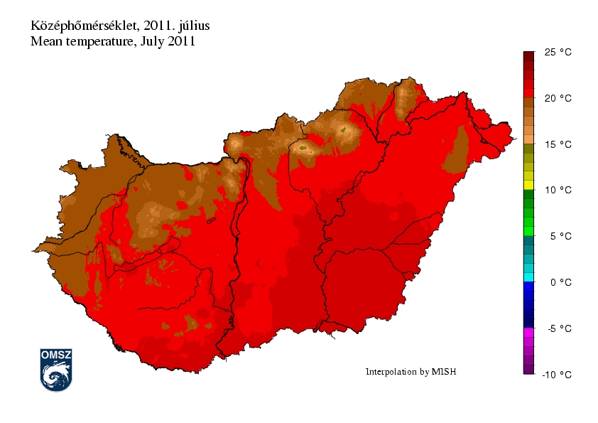 Az ország nagy részén 20 °C-nál magasabb középhőmérséklet uralkodott, magasabb hegységeinket leszámítva ennél hűvösebb a Dunántúlon, a Kemeneshát és a Kisalföld vidékén volt jellemző. A Mátrában és a Bükkben a hőmérséklet ebben a hónapban átlagban 17 °C alatt volt, a Mátrában előfordult 14 °C alatti érték is.