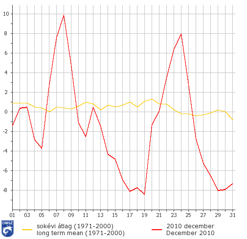 Hazánk egész területén hidegebb volt a szokásosnál decemberben. A hőmérséklet-különbség észak-dél irányú elrendeződést mutatott, a legnagyobb eltérések (-3 - -4 °C) a Duna-Tisza közének északi részén és a Kisalföld területén jelentek meg.