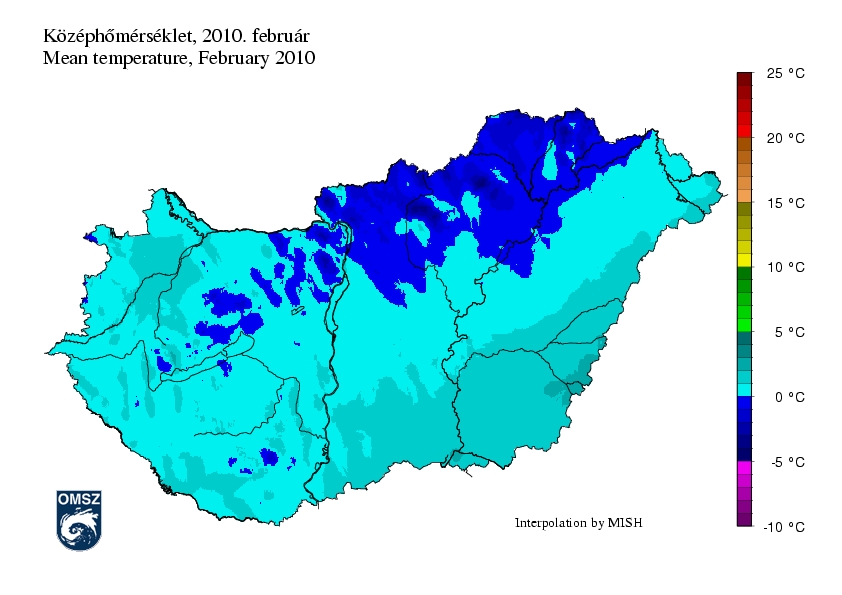 A havi középhőmérséklet országszerte -4,3 és 2,3 °C között alakult. A térképen szépen kirajzolódtak középhegységeink, az értékek jó közelítéssel északnyugat-délkelet irányú növekedést mutattak. A leghidegebb az Északi-középhegységben volt, a legenyhébb időjárás pedig a délnyugati határ mentén a Fekete- és a Sebes Körös közötti vidéket jellemezte.