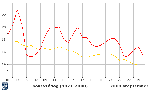 Szeptemberben a napi országos középhőmérsékletek alapvetően az átlag felett helyezkedtek el. Kivételt az időszak eleje jelentett (5-8.), amikor is az országos középérték a sokévi átlag alatt maradt. A legnagyobb pozitív anomália 3-án jelentkezett, ekkor +5 fokot meghaladó eltérés adódott országos átlagban. A hónap legmagasabb hőmérsékletét is ezen a napon regisztrálták Kiskunhalason.