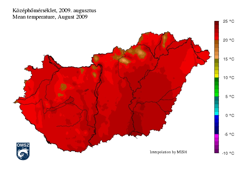 Az ország teljes területén pozitív hőmérsékleti anomália adódott augusztus hónapban. Az országban főként az 1,5 – 2 °C-os eltérés volt a jellemző. A Tisza menti területeken az eltérés mértéke 2 – 2,5 °C közöttinek adódott. Az északi, déli, nyugati határvidékeken a középhőmérséklet 0,5 – 1 fokkal volt a sokévi átlag felett.