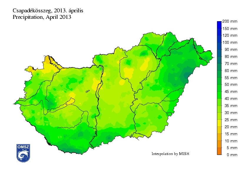 Országos átlagban 37 mm csapadék hullott áprilisban. A legnagyobb mennyiségeket az ÉK-i és a D-DNy-i határterületeken regisztráltuk, itt 50-60 mm-t meghaladó értékek jelentkeznek térképünkön, míg a legkisebb, 25 mm alatti csapadékösszegek a sárgával jelölt területeken hullottak.