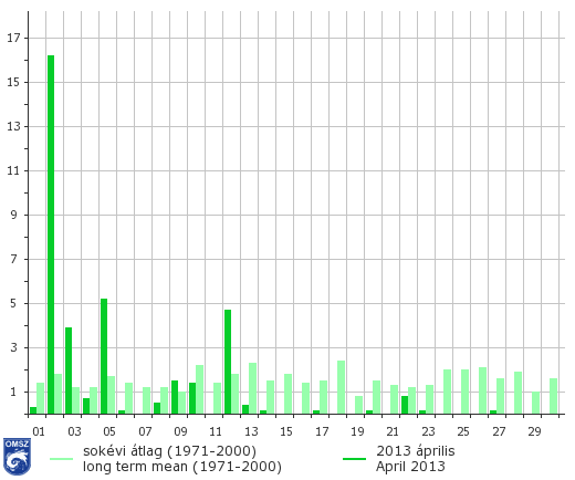 Április első és második fele teljesen eltérő képet mutatott csapadékosság szempontjából. A hónap elején folytatódott a márciusban tapasztalt csapadékos időjárás, az egész hónap csapadékának ~98%-a 14-éig hullott le. Sokéves átlagot meghaladó napi csapadékösszeget ebben az időszakban, országos átlagban összesen 5 napon regisztráltunk, melyből 2 napon hullott 5 mm feletti mennyiség. A legnagyobb napi csapadékösszeget 2-án regisztráltuk, ekkor igen kiemelkedő, 16 mm-es érték adódott országos átlagban. A legnagyobb állomási összeg is ezen a napon jelentkezett: 37,4 mm Gyenesdiás állomáson. A hónap második fele ezzel szemben igen száraz volt, egy napon sem haladta meg az országos átlagban vett napi összeg az 1 mm-t sőt, 9 napon egyáltalán nem regisztráltunk csapadékot az országban. A hónap elején, a hideg időjárásnak köszönhetően, magasabb területeinken még vastag hótakaróval találkozhattunk, az 1-jén, Kékestetőn mért 81 cm-es hóvastagság az eddig mért legnagyobb hóvastagság egész áprilist tekintve.