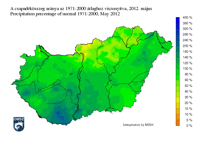 A havi csapadékösszeg térbeli eloszlása igen változékony képet mutatott május hónapban, az állomási összegek 7,1 és 176,7 mm között alakultak. A legcsapadékosabb az ország nyugati, délnyugati része volt, a legtöbb eső (150 mm feletti összegek) ezen belül is a Mecsek területén hullott. A legkevesebb csapadékot a Dunakanyartól északra, északkeletre fekvő térségben regisztráltuk, itt sok helyen a 15 mm-t sem érték el a havi értékek.