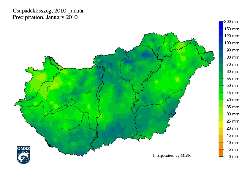 A 2010. januári csapadékösszeg eltérése a sokéves átlagtól széles határok között mozgott. Az ország nagy része csapadékosabb volt a vártnál, általában a szokásos mennyiség 120-240%-a hullott országszerte. Kis terület volt csak az átlagosnál szárazabb. Az Észak-Dunántúlon, különösen a Marcal mentén jelentek meg alacsonyabb értékek, melyek helyenként az átlagos havi összeg 90%-át sem érték el. A legnagyobb pozitív eltérés Borsod-Abaúj-Zemplén megyében rajzolódott ki, itt a szokásos havi csapadékhozam közel háromszorosa is előfordult.