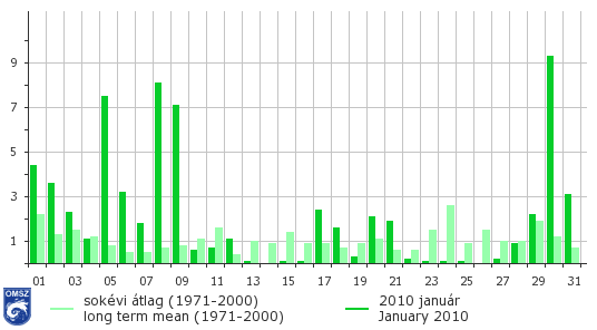 Januárban a csapadék általában hó formájában érkezett, esőről csak azon a néhány napon érkezett jelentés, amikor pozitív átlaghőmérséklet jellemezte hazánkat. A hónapban több napon is előfordult az 1971-2000-es normált többszörösen meghaladó napi csapadékösszeg országos átlagban. A folyamatos havazás miatt 5-én, 7-én és 9-én is kiugróan magas értékek jelentkeztek, de a legcsapadékosabb nap mégis 30-a volt, amikor az átlagos csapadékösszeg a 9 mm-t is meghaladta. Ezen a napon Recsk állomásunkon 42 mm csapadékot mértünk, mellyel megdőlt a napi jellemző csapadékösszeg rekord. A hóvégi erőteljes havazás hatására többfelé rendkívül vastag hótakaró alakult ki, mely nem csak a főváros közlekedését nehezítette meg. Gönci állomásunkon január 30-ról 31-re virradóra mintegy 45 cm-nyi friss hó hullott. Ilyen intenzív havazásra ezen a napon a mérések óta még nem volt példa.