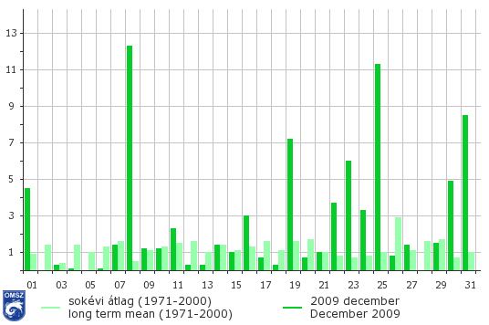 Kiugróan magas napi csapadékösszegek országos átlagban 8-án illetve a hónap végén jelentkeztek, 8-án és 25-én ez az érték a 11 mm-t is meghaladta. Az egy nap alatt hullott csapadékmennyiség rekordja három napon is megdőlt: 8-án Tardosbányán 38,8 mm-t, 23-án Szőlősardón 44,9 mm-t, 25-én Miskolc-Lillafüred – Jávorkút állomásunkon 42,3 mm-t regisztráltunk.