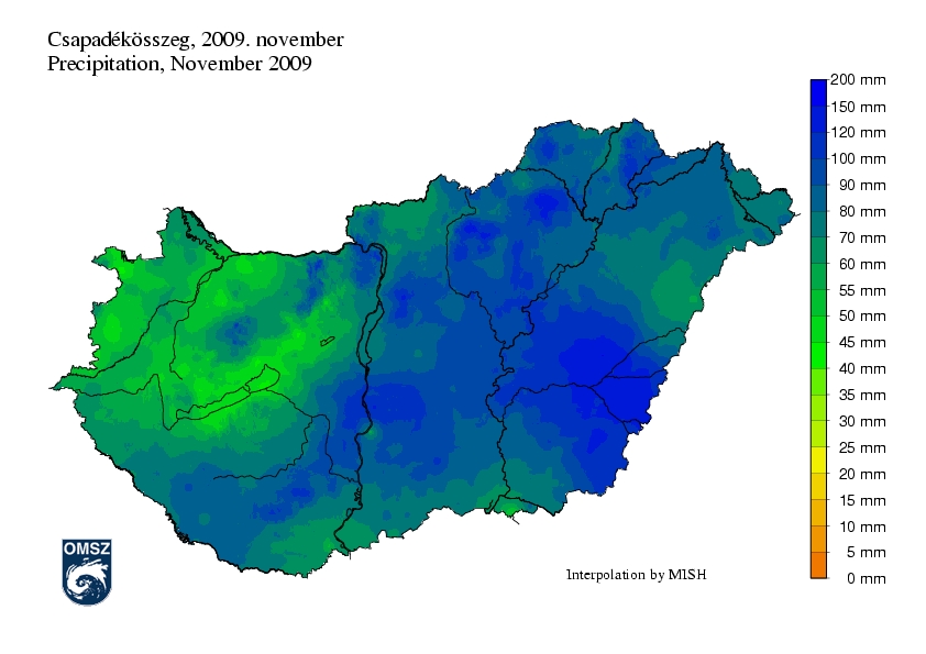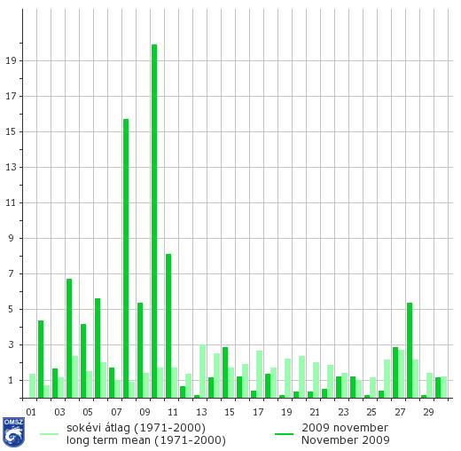 Kiugróan magas napi csapadékösszegek országos átlagban a hónap első felében jelentkeztek, például 10-én 19 mm-t, november 8-án a 15 mm-t megahaladó csapadék volt jellemző. 8-án az erre a napra jellemző 24 órás csapadékmennyiség rekord is megdőlt, Kékestető állomásunkon 74,5 mm csapadékot mértek.
