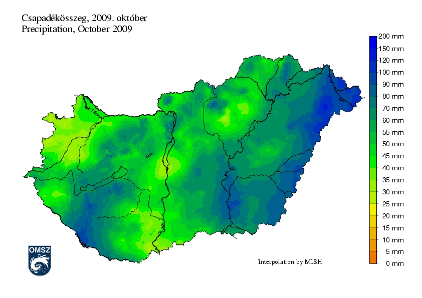 A havi csapadékösszeg közel 60 mm-nek adódott országos átlagban. A legszárazabb területek a Duna mentén az Észak-alföldi-hordalékkúpon és a nyugati országrészben voltak. Ezeken a részeken a havi csapadékösszeg, 30-50 mm között adódott. A legtöbb csapadék főként az ország keleti és délnyugati területén hullott, ahol 80-100 mm közötti havi csapadékösszeget mértek. Lokálisan északkeleten ettől magasabb havi csapadékösszeget is regisztráltak.