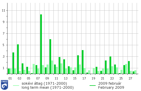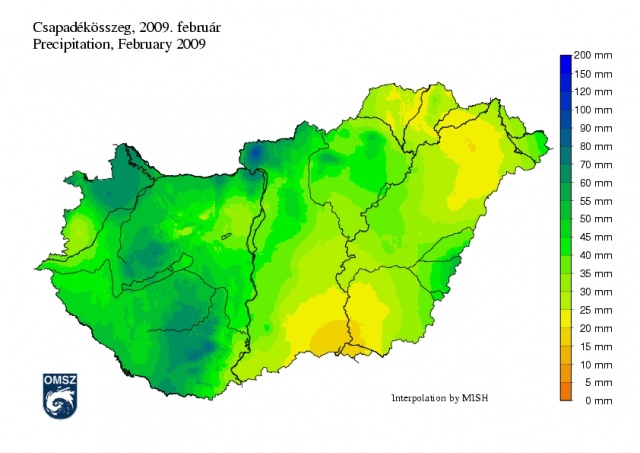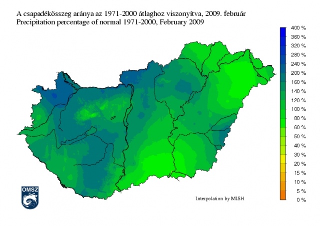 Országos átlagban 2009 februárja átlagos hőmérsékletű, csapadékban gazdagabb volt.