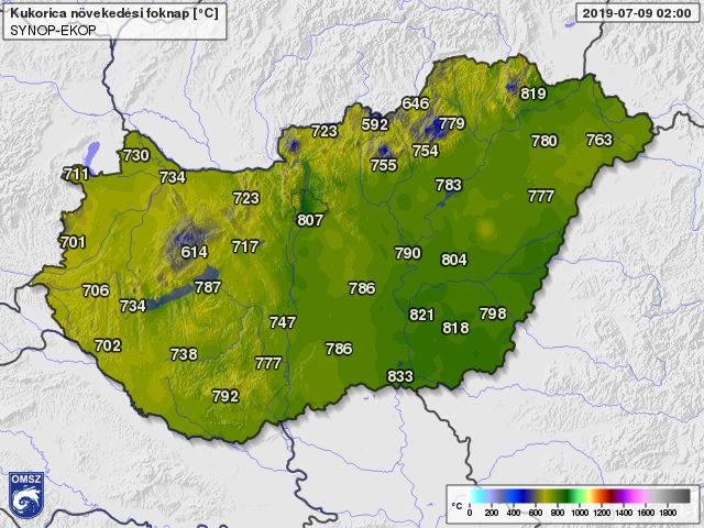 Kukorica növekedési foknap (hőösszeg) 2019. július 7-ig (részletes magyarázat a szövegben)