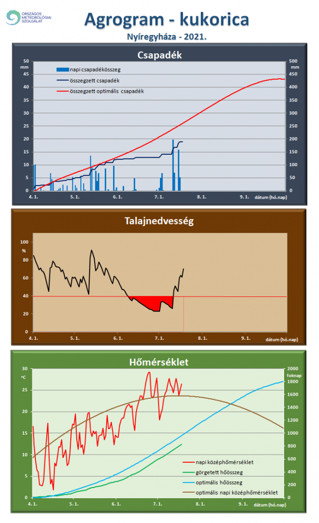 Kukoricára vonatkozó agrogramot Győr és Nyíregyháza térségére vonatkozóan mutatunk be (7., 8. ábra). Nehezen indul a vegetációs időszak a kukorica számára. Országszerte kevesebb eső hullott áprilisban és május elején, mint ami a növény számára optimális lett volna, majd a május közepén érkezett jelentős csapadék sokat segített. Május második felétől alig esett, a talaj folyamatosan veszített a nedvességtartalmából, június első felében már sokfelé a kritikus, 40%-os szint alá csökkent. Az alacsony hőmérséklet is problémát okozott, mert a hűvös időben a talaj hőmérséklete csak nagyon lassan, a szokásosnál jóval később érte el a 10 fokos küszöbértéket, ezért jelentős késést szenvedett a kukorica vetése. A napi középhőmérséklet májusban is csak kevésszer érte el a kukorica számára optimális értéket, a görgetett hőösszeg is jóval az ideális alatt alakul. A növény csirázása, kelése és korai fejlődése ezért lassan, vontatottan haladt. Június elején érkezett meg a meleg, mely a mélyebb talajrétegek többnyire kedvező talajnedvességi viszonyaival együtt közel ideális körülményeket teremtett a növény felgyorsuló fejlődéséhez. Az elmaradt júniusi csapadék miatt azonban a talaj a hónap közepére, második felére egyre jobban kiszáradt, a nehéz szezonkezdetet nehéz június követte. Július is szárazsággal indult, majd 10.-e után egyre többfelé alakultak ki nagy csapadékot adó zivatarrendszerek, és bár ezek területi eloszlása nem volt egyenletes, de a hónap közepén az ország jelentős részén csökkent a szárazság, és a vegetációs időszak kezdete óta felhalmozódott csapadékhiány. Ez az eső azonban már nem tudja pótolni az előző fenológiai fázisokban elszenvedett hiányt, az alacsony, korán öregedésnek indult állományok már nem tudják utolérni magukat.