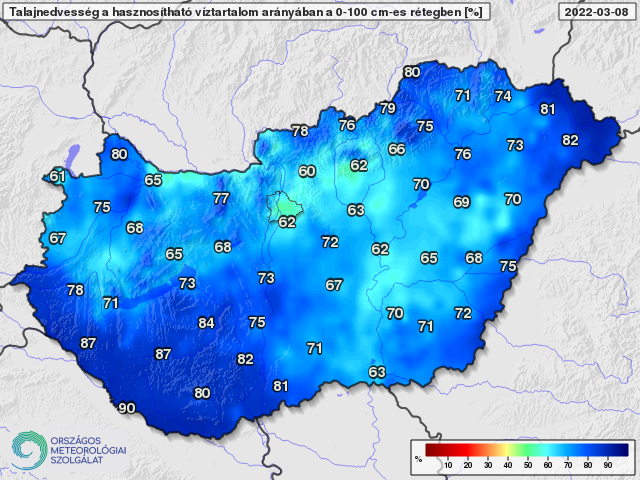 a talaj felső egy méteres rétegében 2022. március 8-án (%)