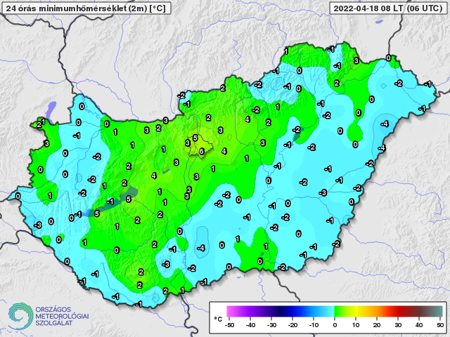 A hőmérséklet a múlt héten fokozatosan emelkedett: a hétfői 11-13 Celsius fokos maximumok csütörtökön már országszerte kevéssel 20 fok fölött alakultak. A pénteki hidegfront mögött egyre hidegebb levegő érkezett, így vasárnap már újra csak 12-13 fokig melegedett délutánra a levegő. A nagyobb probléma a minimumokkal volt és van, hiszen a tavaszi fagyok folytatódtak: hétfőtől péntekig sokfelé hűlt -1, -3, néhol -5 fokig a levegő. A front felhőzete és szele mérsékelte a lehűlést, majd ma reggelre újra az ország mintegy felén kevéssel fagypont alá csökkent a hőmérséklet (5. ábra).