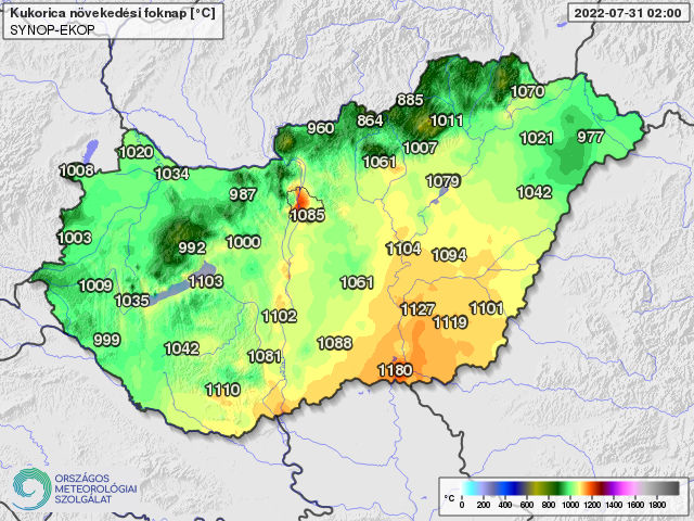 A kukoricatermesztésben használatos 10 fokos bázishőmérséklettel április 1-től számolt hőösszegek dinamikusan növekednek, jelenleg többnyire 1000 és 1130 foknap között alakulnak (7. ábra). A nagyobb értékek a délkeleti, az alacsonyabbak az északi és nyugati országrészre jellemzőek. Az idei értékek jellemzőem 40-70 foknappal haladják meg a sokéves átlagot, a tavalyinál pedig 30-100 foknappal magasabbak, (a 2021. év a hűvös májusáról is emlékezetes). Ez azt jelenti, hogy a növények fenológiai fázisai a hőmérséklet hatására tavalyinál körülbelül egy héttel korábban, és az ilyenkor szokásosnál is néhány nappal hamarabb következnek be, ugyanakkor az aszály miatt is lerövidülnek a fázisok a kényszerérés miatt.