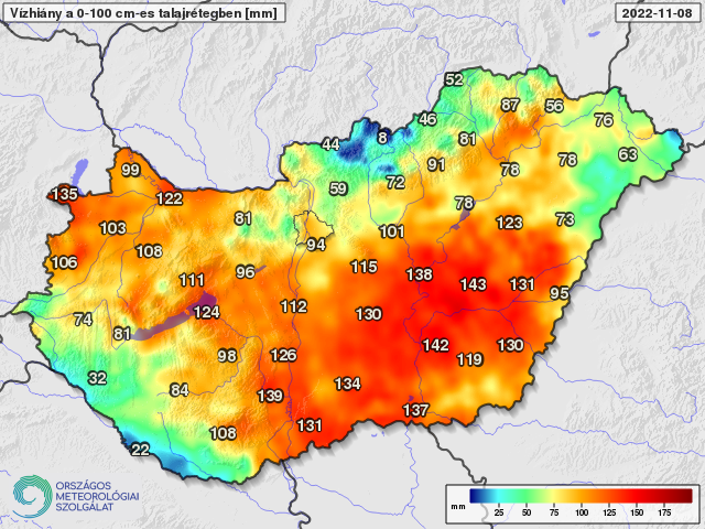 Vízhiány a telítettséghez képest a talaj felső egy méteres rétegében 2022. november 8-án (mm)