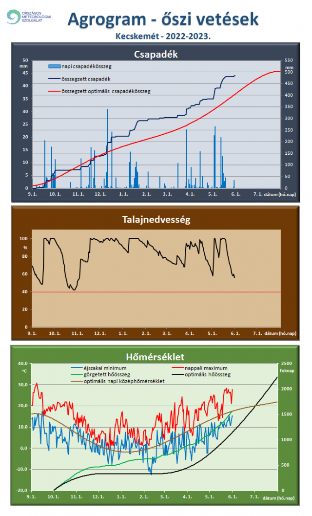 * Az őszi vetésű kalászosok számára ideális, illetve a tényleges időjárási paraméterek (csapadék, talajnedvesség, hőmérséklet) összevetése látható az agrogramnak elnevezett ábrán. A legfelső, a csapadékot ábrázoló grafikonon megjelenik a napi csapadék (bal oldali tengelyen), az időszak során összegzett és a növény számára optimális összegzett csapadék (jobb oldali tengelyen). Így jól látszik a két utóbbi érték közötti eltérés, ami a csapadékhiányt vagy -többletet mutatja. A talajnedvesség ábrán a növények számára felvehető hasznos vízkészlet százalékában vannak megadva az értékek. Szeptember és október hónapokban a talaj felső 20 cm-es rétegét, a későbbiekben a felső 50 cm-es rétegét ábrázoljuk. A már kritikusnak tekinthető 40%-os érték alatti időszakot pirossal emeljük ki. A hőmérséklet ábrán a napi hőmérsékleti szélsőértékek mellett a növény számára optimális napi középhőmérsékletet (bal oldali tengelyen), valamint a görgetett hőösszeget (2 Celsius fokos bázissal) és ennek optimális értékeit mutatjuk be (jobb oldali tengelyen).