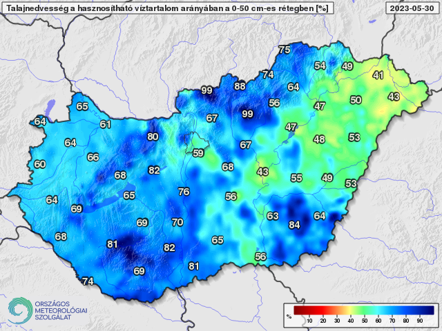 A talajok felszín közeli néhány centiméteres rétege az elmúlt napok záporaiból kimarad területeken elég száraz, a középső talajréteg viszont a Tiszántúl északi felének kivételével a legtöbb helyen jó vízellátottságú (5. ábra), a fél-egy méter közötti réteg pedig közel telített állapotban van. Ez jó nedvességtartalékot jelent a nyári növények számára egy esetleges nyári aszály során.