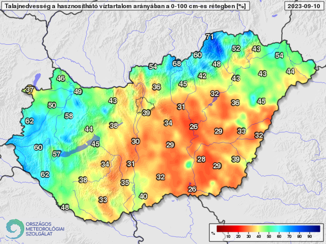 A mögöttünk álló egy hétben egy Európa nagy részére kiterjedő anticiklon hatására túlnyomóan derült, száraz, az ilyenkor szokásosnál melegebb időben volt részünk. Csapadék sehol sem hullott hazánkban, de az Alföld déli, délnyugati tájain és a Dunántúl nagy részén szeptemberben még egyáltalán nem esett, a keleti, északkeleti országrészben is csak a hónap első napjaiban voltak záporok, zivatarok (1. ábra). Az elmúlt 30 nap csapadékösszege néhány nagyobb felhőszakadás által érintett folt kivételével az ország nagy részén jóval elmarad az ilyenkor szokásostól, sokfelé a sokéves átlag fele sem esett (2. ábra), és a 90 napos csapadékösszeg is csak kevés helyen mutat pozitív anomáliát (3. ábra). A felszín közeli talajréteg jellemzően még jó vízellátottságú, bár az Alföldön vannak már kritikusan száraz területek (4. ábra). A középső és mélyebb rétegek a Dunántúl keleti, délkeleti tájain és nagy területen az Alföldön is igen szárazak, a növények számára hasznosítható vízmennyiség kevesebb, mint 40%-át tartalmazzák (5. ábra), bár az ősz eleji időszakban ez elég jellemző.