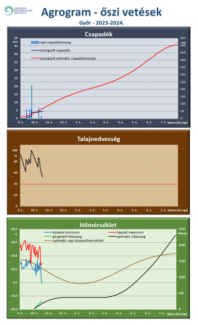 * Az őszi vetésű kalászosok és az őszi káposztarepce számára ideális, illetve a tényleges időjárási paraméterek (csapadék, talajnedvesség, hőmérséklet) összevetése látható az agrogramnak elnevezett ábrán. A legfelső, a csapadékot ábrázoló grafikonon megjelenik a napi csapadék (bal oldali tengelyen), az időszak során összegzett és a növény számára optimális összegzett csapadék (jobb oldali tengelyen). Így jól látszik a két utóbbi érték közötti eltérés, ami a csapadékhiányt vagy -többletet mutatja. A talajnedvesség ábrán a növények számára felvehető hasznos vízkészlet százalékában vannak megadva az értékek. Szeptember és október hónapokban a talaj felső 20 cm-es rétegét, a későbbiekben a felső 50 cm-es rétegét ábrázoljuk. A már kritikusnak tekinthető 40%-os érték alatti időszakot pirossal emeljük ki. A hőmérséklet ábrán a napi hőmérsékleti szélsőértékek mellett a növény számára optimális napi középhőmérsékletet (bal oldali tengelyen), valamint a görgetett hőösszeget (2 Celsius fokos bázissal) és ennek optimális értékeit mutatjuk be (jobb oldali tengelyen).