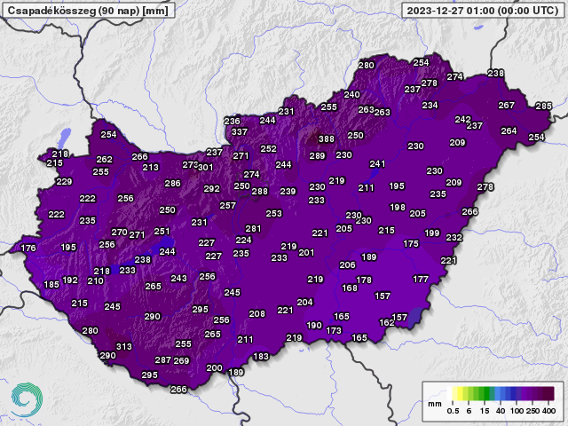 90 napos csapadékösszeg 2023. december 27-ig (mm)