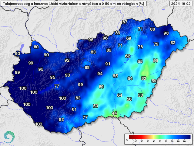 A hét első napjaiban száraz, de hűvös időben volt részünk, majd szerdán hajnalban nyugat felől hullámzó frontrendszer érkezett, melynek hatására csütörtök reggelig hazánk nyugati, északnyugati felén 15-30 mm, míg délen és a Tiszántúlon 1-5 mm csapadék hullott. A hétvégén északnyugaton volt kevesebb eső, így az elmúlt öt nap csapadékösszege jellemzően 15 és 35 mm között alakult, de foltokban 40-50 mm is leesett (1. ábra). A 30 napos csapadékmennyiség országszerte meghaladja a sokéves átlagot (2. ábra), keleten 50-120 mm, míg a Dunántúlon 100-180 mm-t mérhettünk (3. ábra). A 90 napos összeg azonban hazánk jelentős részén továbbra is számottevő negatív eltérést mutat (4. ábra). A felszínközeli talajréteg országszerte telítetté vált, és a 20-50 cm-es réteg is bőven tartalmaz nedvességet (5. ábra). A fél méternél mélyebb rétegben viszont az északnyugati országrész kitételével továbbra is igen jelentős a nedvességhiány (6. ábra).