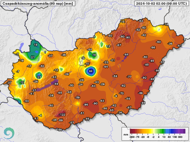 Az elmúlt 90 nap csapadékösszegének eltérése a sokéves átlagtól 2024. október 2-ig (mm)