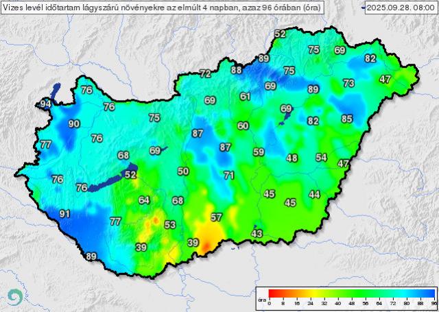 Vizes levél időtartam lágyszárú növényekre a 2025. szeptember 28. reggel 8 órát megelőző 96 órában (óra)